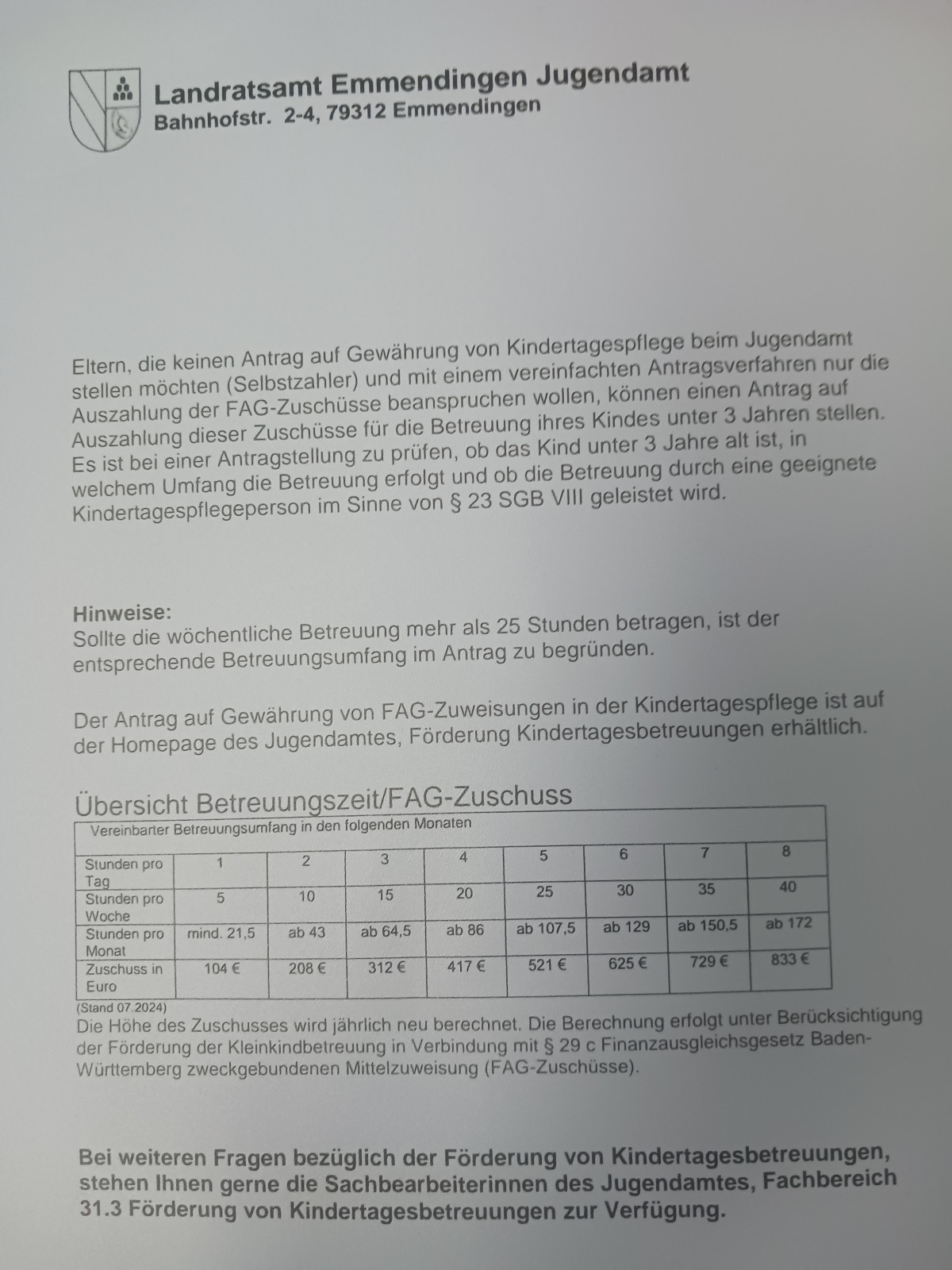 Der Kostenträger ist: Es gibt zwei verschiedene Arten von Zuschuss - Beantragung in der Kindertagespflege Stelle bei Landratsamt/ Jugendamt EM.